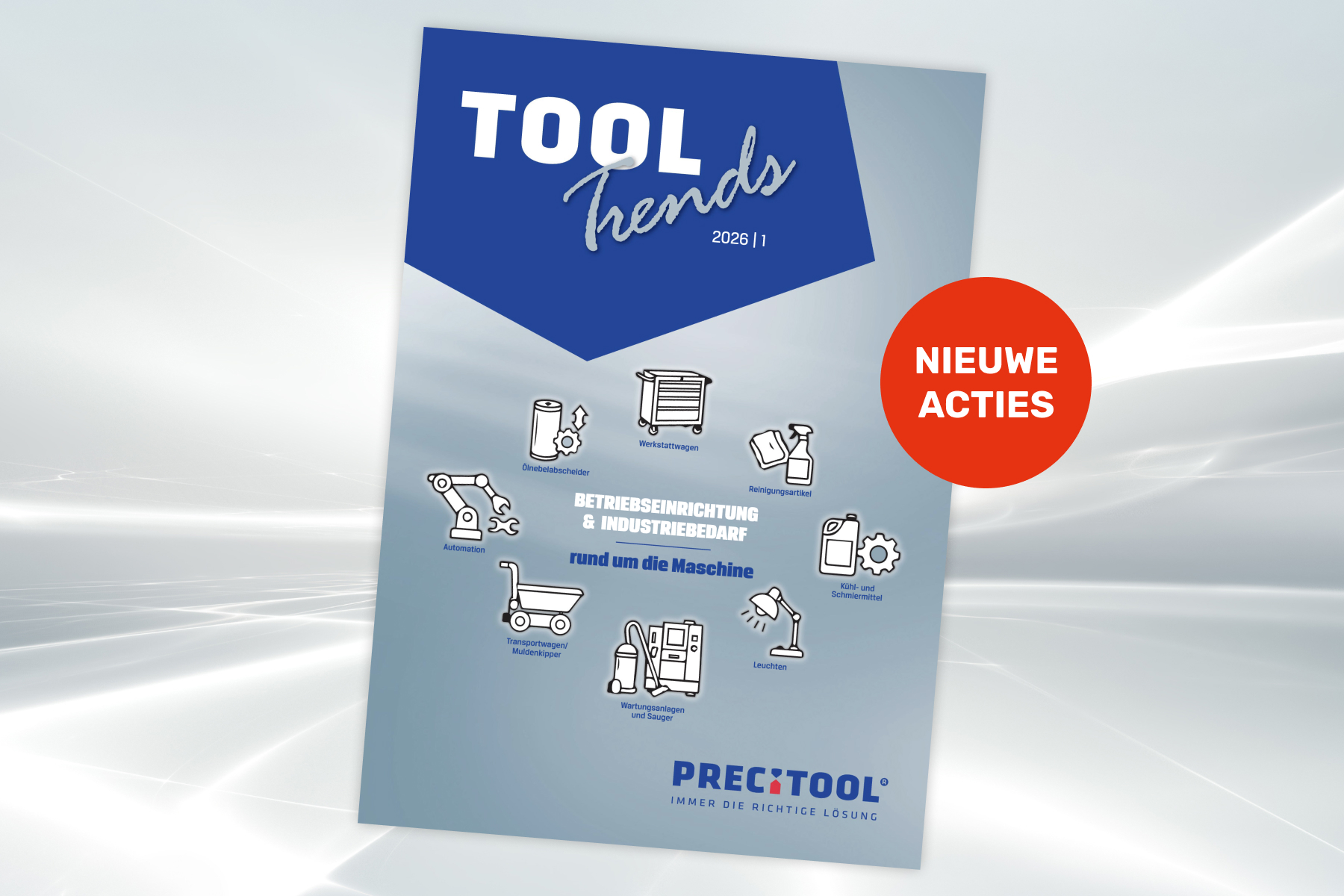 Ontdek onze actuele acties in de TOOL Trends 2026 | 1: bedrijfsinrichting en industriebenodigdheden rondom de machine, van werkplaatswagens en reinigingsartikelen tot koel- en smeermiddelen, verlichting, onderhoudsinstallaties, transportwagens, automatisering en olienevelafscheiders.